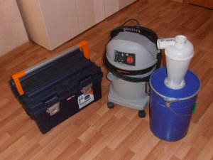 Штроборез-бороздодел «Фиолент» модели Б3-40 с эффективной системой пылеудаления (включающей промышленный пылесос и промежуточный фильтр системы циклон с емкостью для сбора пыли). Благодаря применению промежуточного фильтра, большая часть пыли попадает в отдельную емкость для отходов, а не в мешок пылесоса. Поэтому он загрязняется гораздо медленнее. А это влияет на силу всасывания пыли.
