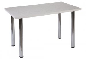 Самые бюджетные варианты обеденных столов для стандартной кухни выполнены из покрытия ЛДСП 16, 22мм, ДСП покрытой пластиком ударопрочным, влагостойким, устойчивым к истиранию, высокой температуре или плиты МДФ 18мм покрытой пленкой, устойчивой к химическим воздействиям, обесцвечиванию и образованию пятен. Торцы столешниц облицованы кромкой меламин или ПВХ 2,0 мм. Ножки столов изготовлены из стальной электросварной тонкостенной хромированной трубы Ø60х1,5 мм и установлены на регулируемые пластмассовые опоры. Для крепления ножек применены штампованные кронштейны из листовой хромированной стали толщиной 1,2 мм. Каждая ножка крепится болтами/гайками/шайбами М8. Имеют презентабельный внешний вид, сборка занимает 10-15 минут, устойчивы и надежны, что касается долговечности, то основания (ноги) для стола прослужат Вам не один год.