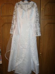 Продам свадебное платье, материал плотный, по бокам талии шнуровка, размер 44-46, рост 160, белое, плечи закрытые гипюром, который переходит в рукава. По всей длине платья разрез с вышитыми цветами.+ фата. Платье хранится в чехле. Состояние хорошее. Цена 4000 руб. Торг уместен.