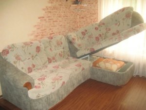Угловой диван б/у. Спальное место 200х135. 4-е съемные подушки на липучках в чехлах на молнии. Деревянные вставки на подлокотниках и внизу дивана. Ящик для белья.