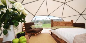 Минимальное типовое решение мини-отеля Глампинг включает в себя 5 куполов диаметром 8 метров каждый. Деревянные полы с подогревом, кожаные или льняные “стены”, полноценные санузлы, добротная деревянная мебель, долговечное льняное постельное бельё, панорамные окна, управление климатом и термоизоляция, позволяют постояльцам почувствовать себя как в президентском номере отеля 5 звёзд. При желании и возможностях участка, вы можете заказать у нас любое требуемое количество дополнительных шатров для расширения вашего дела. Административные и технические помещения, ресторан, магазин сувениров, салон красоты и гимнастический зал могут удобно расположиться в куполах.