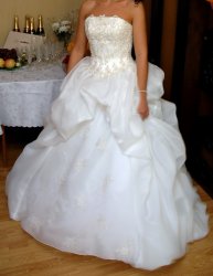 Я продаю очень красивое и в единственном экземпляре свадебное платье. Одевала всего 1 раз, после химчистки, состояние отличное. Цвет платья — брызги шампанского, при разном свете может казаться жемчужного цвета. Размер 42-44-46 (благодаря шнуровке на корсете), рост 161-170. Платье состоит из корсета на шнуровке на спине и юбки. К нему прилагается подъюбник с 1 кольцом для пышности. На корсете вышивка золотыми нитками и пришит жемчуг – ручная работа. Юбка с небольшим шлейфом, что придает индивидуальность. Платье Очень удобное при ходьбе, танцах и сиденье за столом, не мнется, легкое и богатое. Я ещё подобного не видела. В этом платье вы будете самая красивая, и притяните взгляды.