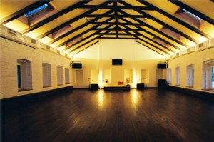 Площадь большого зала 130 кв. м., высота потолков 7 м, пол из натурального дуба, большое количество окон.