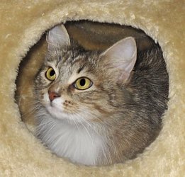 Очень ласковая, но совсем ненавязчива. Совершенно домашняя, уютная кошечка! На ласку откликается чрезвачайно громким, длительным мурлыканьем.