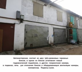 Автомастерская находится на расстоянии 500 метров от МКАД (62 км). Состоит из 6 помещений, 2 подвала, 2 помещения на первом этаже и 2 на втором. На первом этаже покрасочная камера и подъёмник. На втором комната отдыха, душевая и склад. В подвалах установлена печь для отопления, склад с дровами и отработанным маслом (отопление работает на дровах и отработанном масле, в подвале размещено вентиляционное оборудование и компрессор с фильтрами. Документы на объект имеются. Подробности по телефону