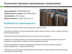 Продается прибыльный готовый бизнес, розничная торговля напольными покрытиями. Бизнес работает с 2003 года, состоит из двух магазинов, которые расположены в торговых центрах Москвы с высокой проходимостью, а так же современного интернет магазина. В продажу входит торговое оборудование (экспозиторы, плиточные стенды и т. п.), образцы напольных покрытий, компьютерная и офисная техника, телефонные номера с наработанной базой клиентов, поставщиками, обученным персоналом 5 человек, и как бонус автомобилем Citroen Jumper 2013 года. Прибыльность бизнеса более 5млн. рублей в год, продается по причине переезда в другую страну, стоимость продажи 10млн. рублей. Подробности по телефону: 8-925-802-37-27.