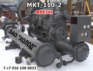 МКТ 110-2-0 — фреоновая (R-22) холодильная машина на базе 4-х цилиндрового поршневого компрессора П-110 (2П-110) с водяным охлаждением конденсатора. МКТ 110-2-0 предназначена для охлаждения технологического хладоносителя (вода, рассол, этиленгликоль) в диапазоне температур +10 …… — 15 0С. Холодильная машина МКТ 110-2-0 состоит из кожухотрубных конденсатора КР-43 с водяным охлаждением, испарителя ИТ-30 с внутритрубным кипением фреона и регенеративным теплообменником, компрессора П-110 (2П-110) и электродвигателя 75 кВт / 1500 об/мин. Все перечисленные агрегаты компактно смонтированы на одной раме и соединены трубопроводами с запорной и регулирующей арматурой.