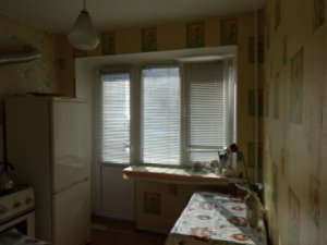Кухня небольшая с выходом на балкон, за счет которого можно ее увеличить, окна и дверь выходящая на балкон заменены на ПВХ.