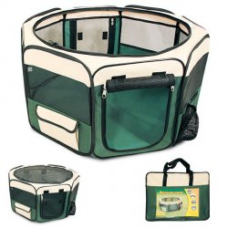 Вольер снабжен ремнями для крепления к земле, карманом для бутылки с водой и карманом для аксессуаров. Запатентованная конструкция дает возможность легко и быстро собрать вольер.