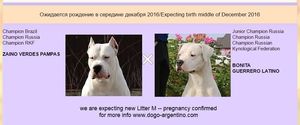 В питомнике «Пахра Магнифика» (РКФ) в декабре 2016 ожидаются рождение двух пометов щенков аргентинского дога.