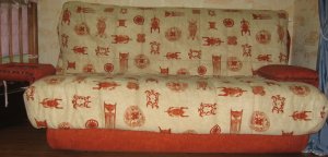 Продам диван«Мечтатель», б/у в отличном состоянии. размера 1.6:200Х160. по бокам расклодной столик. Оранжевого/бежевого цвета с рисунками на африканскую тематику.