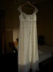 Платье в хорошем состоянии, одевалось один раз 14 августа 2009 г. 54 размера, светло-кремовое с завышенной талией, длина до пола, верх ажурный с V-образным вырезом, сзади шнуровка, ткань легкая. Прилагается накидка ажурная с длинным рукавом.
