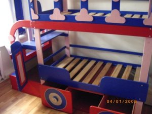 Двухъярусная детская кровать, б\у, привезена из Италии яркая, красивая, в форме машины. со множеством удобных ящиков, из дерева, очень надежная и прочная. Размеры: 220х90, матрас 154см, Для детей до 11 лет.