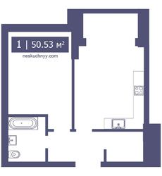 Общая площадь квартиры 50,5 кв. м., жилая площадь 40 кв. м., площадь кухни 12 кв. м., гардеробная.