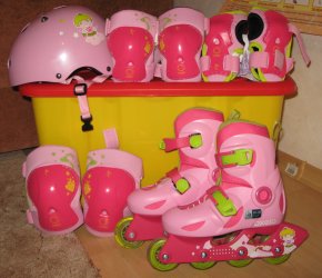 Детские раздвижные ролики фирмы OXELO размер 28-30 с защитой на коленки, локти, ладони + шлем + сумка для роликов. Цвет розовый. Защита и шлем не использовались, ролики были одеты 2 раза в спортзале — состояние идеальное!
