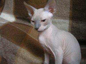 Продается котик Донского сфинкса. Родился 16 сентября. Окрас кремовый биколор пойнт с голубыми глазами.