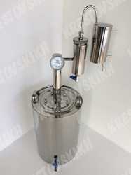Дистиллятор фланцевый. Бак на 12 литров, высота 300мм, диаметр 225мм, толщина металла 1мм, марка стали металла aisi304, диаметр горловины 100мм, толщина дна 1мм (дно имеет 2 ребра жесткости), подходит для газовых и электрических плит. Толщина фланца 1.5мм. Царга- высота 150мм, диаметр 40мм. Сухопарник разборный, диаметр 40мм, высота 150мм. Охладитель- диаметр 80мм, высота 150мм, диаметр трубки 8мм, длинна спирали 70мм. В комплект входит биметаллический термометр.