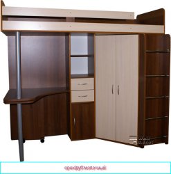 Кровать-чердак М85 может быть выполнена в основном цвете: орех, ольха, дуб молочный и дополнительными цветами: ольха, дуб молочный, рыжий, синий. Универсальный криволинейный выдвижной компьютерный стол. Кромка столешницы оклеена пластиком. Удобная маленькая библиотека. Шикарная кровать на втором уровне с элементами из металла. Второй ярус станет для ребенка большим кораблем или непреступным замком. Безопасность! Скругленная кромка деталей фасада сократит угрозу ссадин и синяков при игре в индейцев. Детская по душе, как мальчикам, так и девочкам. У ребенка есть удобный шкаф для его собственных вещей одежды, игрушек, книг. Детская М85 занимает площадь всего 1,6 м2 вашей комнаты. Представленную продукцию Вы можете посмотреть и купить на сайте мебельного интернет магазина WellMebel в разделе «детские стенки» httpwellmebel.ru/nursery/section/side/m85/