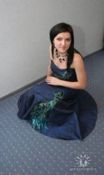 Продам платье, новое, модель «Рыбка», цвет — темно-синий мерцающий, голые плечи без бретелек, рисунок — ручная работа «Перо жар-птицы», размер 38-44, длина — по пяты, привезено из Венгрии