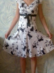 1) черно-белое, завязывается черной ленточкой на бантик спереди, летящая юбка, красивый черно-белый орнамент. Цена 2000 рублей.