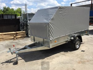 Прицеп комплектуется высоким тентом с клапаном в задней и боковой части на жестком каркасе и передним опорным колесом.