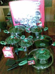 в наборе также сковорода, пароварка\фритюрница, ковшик, набор для специй и 3 пластиковых лопатки\половника. пр-во Германия.