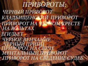 Черный приворот — обычный черный приворот. Оказывает небольшое воздействие. Кладбищенский Черный приворот — один из самых сильных приворотов, оказывает очень сильное воздействие. Черное венчание — после него особа уже не может ни с кем создать нормальных отношений