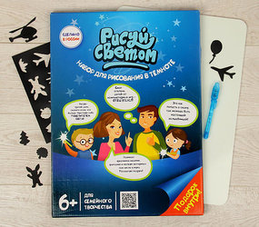 Интерактивный набор для рисования в темноте, состоит из фотолюминесцентного экрана в рамке-планшете, светового маркера и трафаретов.
