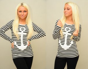 Стильно, дерзко, эффектно, удобно! Именно так можно охарактеризовать сине-белую женскую тельняшку, украшенную ярким красным принтом в виде якоря! Слегка удлиненный приталенный крой хорошо «садится» по любой фигуре, деликатно подчеркивая ее достоинства и скрывая недостатки. Актуальная расцветка хорошо подходит к одежде в любой цветовой гамме.