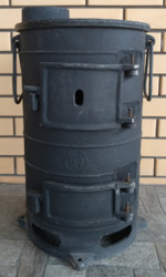 Печь Буржуйка чугунная, изготовлена в 70-х годах 20-го века, поздний СССР. Производилась для нужд советской армии и министерства путей и сообщений, предназначалась для отопления палаток, казарм, вагонов. Изготовлена из чугуна с добавлением стали, что придает ей стойкость к сколам и трещинам. Не боится попадания воды.