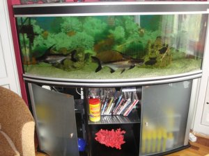 Продам панорамный аквариум б/у. Aquatlantis — Evasion Horizon 150 с тумбой (стеклянные двери). 400 литров, Размер аквариума 150*55*60 см. Высота тумбы 76 см. Лампы аквариума: 2*36w. Цвет черный. Дополнительное оборудование: 2 внешних фильтра Eheim, обогреватель fluval tronic, 2 компрессора schego, Ультрафиолетовый стерилизатор, грунт, камни, декоративные замки, пластиковые растения. Рыбы – 2 высокоплавничих пангасиуса – большие и красивые рыбы, похожие на акул (35 и 40 см). Цена 50 000 руб. (Стоимость комплекта около 150 000 р.) 8-910-440-57-17 Мария