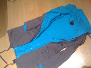 Пальто размера S, одето 1 раз. Длина пальто — до колен. Состоит из 2-ух частей — внутренней подкладки бирюзового цвета и внешней серой части. Подкладку можно убрать, и тогда пальто превращается в серый плащ.