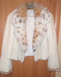 Шубка застегивается, есть карманы. Стриженная норка белого цвета с узором.