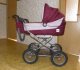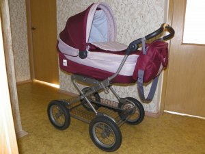 В отличном состоянии, цвет бордовый с розовым, материал непромокаемый и не продуваемый, ход плавный, колеса надувные, люльку легко качать, люлька просторная, спинка регулируемая (ребенок может сидеть в коляске), система кондиционирования, положение люльки: к себе лицом или к дороге.
