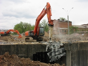 Для сноса фундаментов крупных объектов: заводов, фабрик, ангаров дополнительно привлекается более эффективная и производительная техника: