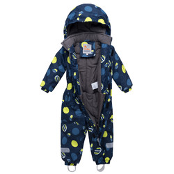 Модель имеет яркий дизайн, и представлена в нескольких цветовых вариантах. Комбинезон оснащен лямками на штанинах, манжетами на рукавах (со съемными штрипками), и отстегивающимся капюшоном. В обязательном порядке имеются светоотражающие элементы.