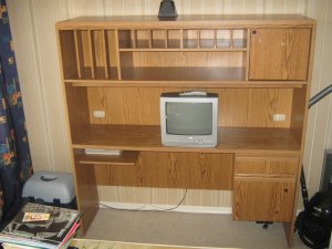 Стенка — длина 150 см., ширина 40 см., высота 153 см. Три ящика: два нижних выдвижных, верхний. Может использоваться как рабочее место или для учёбы.