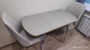Стол — обеденный, раздвижной. Столешница — матовое закаленное стекло. Размеры — 1200 (900)Х600. Стандартная высота.