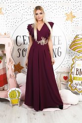 Нарядный вечерний комбинезон приталенного силуэта, верх которого выполнен на запах. Отрезной по линии талии. Двойные крылышки вшиты в рельефы полочки и спинки. Нижняя часть- юбка-брюки. По среднему шву спинки вставлена потайная молния. Элегантность комбинезону придают кружевные фрагменты с бисером.