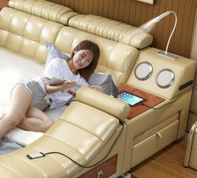 В кровати имеется отдельное место для массажа, Blootooth колонки, выдвижная подставка под ноутбук.