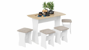 Комплектация: стол + 4 табурета, материал мягкого сидения — кожзам.