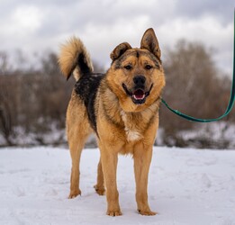Гром метис немецкой овчарки и солнца. От первого родителя он взял ум, внимательность, неутомимость в играх, привязанность к своему человеку и выносливость при физических нагрузках, а яркий рыжий окрас достался от второго.