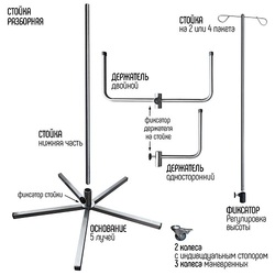 Конструкция разборная: стойка штатива крепится на цельносварную крестовину с пятью колесами. Два колеса имеют индивидуальный тормоз для фиксации штатива в помещении.