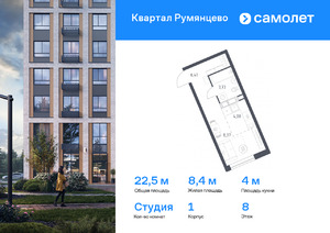 Строим кварталы для жизни с заботой о будущем. Предлагается квартира студия комфорт-класса 22,51 кв. м в корпусе 1 на 8 этаже, в ЖК «Квартал Румянцево»