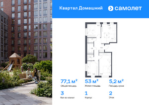 Строим кварталы для жизни с заботой о будущем. Предлагается 3-комнатная квартира комфорт-класса 77,12 кв. м в корпусе 1 на 2 этаже, в ЖК «Квартал Домашний»