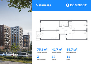 Строим кварталы для жизни с заботой о будущем. Предлагается 3-комнатная квартира комфорт-класса 75,07 кв. м в корпусе 17 на 11 этаже, в ЖК «Остафьево»
