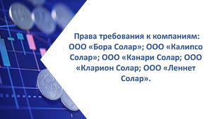 Код лота: РАД-439226. Реализуется на торгах. На продажу с торгов выставлены права требования ООО «КапиталЮгИнвест» к компаниям: — ООО «Бора Солар» (ИНН: 9102070331) по Договору от 28.12.2012 № 20-4263/3-2 на сумму 14 212 478 081,14 руб., подтверждённые Определениями Арбитражного суда Республики Крым от 13.04.2022, от 14.06.2023, от 11.10.2023, от 22.03.2024 по делу № А83-3089/2020; — ООО «Калипсо Солар» (ИНН: 9102162053) по Договору от 28.12.2012 № 20-4267/3-2 на сумму 1 577 636 856,65 руб., подтверждённые Определениями Арбитражного суда Республики Крым от 24.10. 2022, от 18.07.2023, 18.10.2023, от 09.04.2024 по делу №А83-3093/2020; — ООО «Канари Солар» (ИНН: 9102067642) по Договору от 28.12.2012 № 20-4266/3-2 на сумму 1 475 138 218,99 руб., подтверждённые Определениями Арбитражного суда Республики Крым от 24.10.2022, от 18.07.2023, от 18.10.2023 по делу № А83-3092/2020; — ООО «Кларион Солар» (ИНН: 9102067850) по Договору от 28.12.2012 №20-4265/3-2 на сумму 3 653 108 468,06 руб., подтверждённые Определениями Арбитражного суда Республики Крым от 26.07.2022, от 06.02.2023, от 25.07.2023 по делу № А83-3090/2020; — ООО «Леннет Солар» (ИНН: 9102168383) (ИНН: 9102168383) по Договору от 28.12.2012 № 20-4264/3-2, по Кредитному договору от 27.12.2013 № 20-4211/2-1 на сумму 12 739 066 098,23 руб., подтвержденные Определениями Арбитражного суда Республики Крым от 28.05.2021, от 09.02.2024 по делу №А83-3091/2020. Краткое описание должников: Все компании были созданы в 2011 году в республике Крым до его присоединения к РФ. Основные владельцы: в ООО «Бора Солар» и ООО «Канари Солар» основной владелец Midesiano Investments, в ООО «Кларион Солар» и ООО «Калипсо Солар» Koltreso Commercial, в ООО «Леннет Солар» Samelina Investments. Владельцы зарегистрированы на Кипре. Все должники в 2020 году признаны несостоятельными (банкротами) и в отношении них открыто конкурсное производство. Основную хозяйственную деятельность не ведут в связи с отсутствием технологической и технической возможности передачи электроэнергии. В составе обеспечительного имущества прав требования ООО «КапиталЮгИнвест» к должникам находится недвижимое имущество электростанции на источниках солнечной энергии, выступающие предметом залога по договорам ипотеки и расположенные на земельных участках Автономной Республики Крым, Кировского района, сельского совета Владиславовского. Земля находится в долгосрочном пользовании на основании договоров аренды земельных участков с Министерством земельных и имущественных отношений Республики Крым. На конец 2021 года надлежащая регистрация переоформления прав на земельные участки в соответствии с законодательством РФ не произведена. Основным дорогостоящим оборудованием СЭС являются фотоэлектрические модули CNBM мощностью 240 Вт и 245 Вт. На дату перехода прав требований к Покупателю размер прав требований может быть изменен (актуализирован) на сумму погашения задолженности перед Должником. Подробнее в Информационном сообщении.