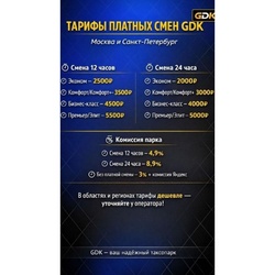 Таксопарк GDK предлагает вам эксклюзивные условия для работы в нашем парке.