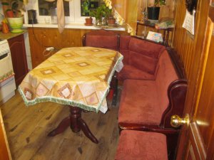 Чистая ванна, Уютная кухня Гарнитур Уголок. Пол Ламинат.