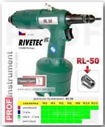 Пневмогидравлический заклепочник для резьбовых заклепок RIVETEC RL50 — устанавливает гаечные и винтовые заклепки. Инструмент предназначен для расклепывания резьбовых заклепок от М3 до М10.